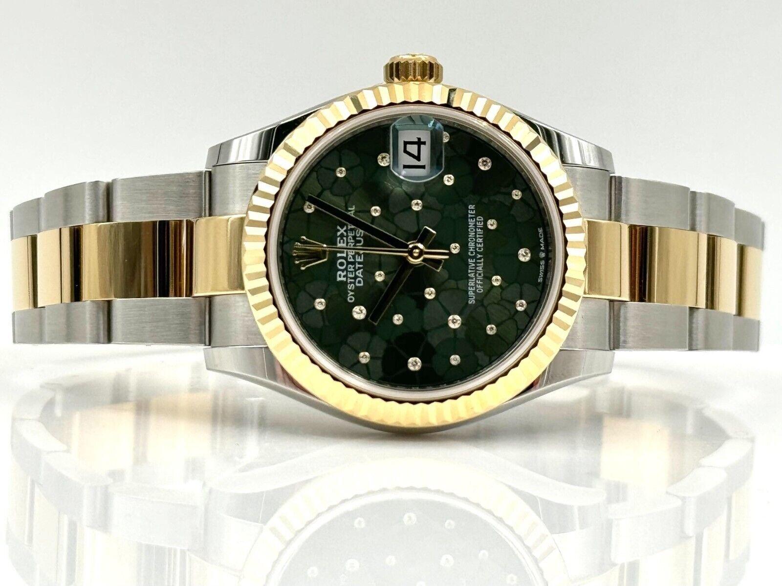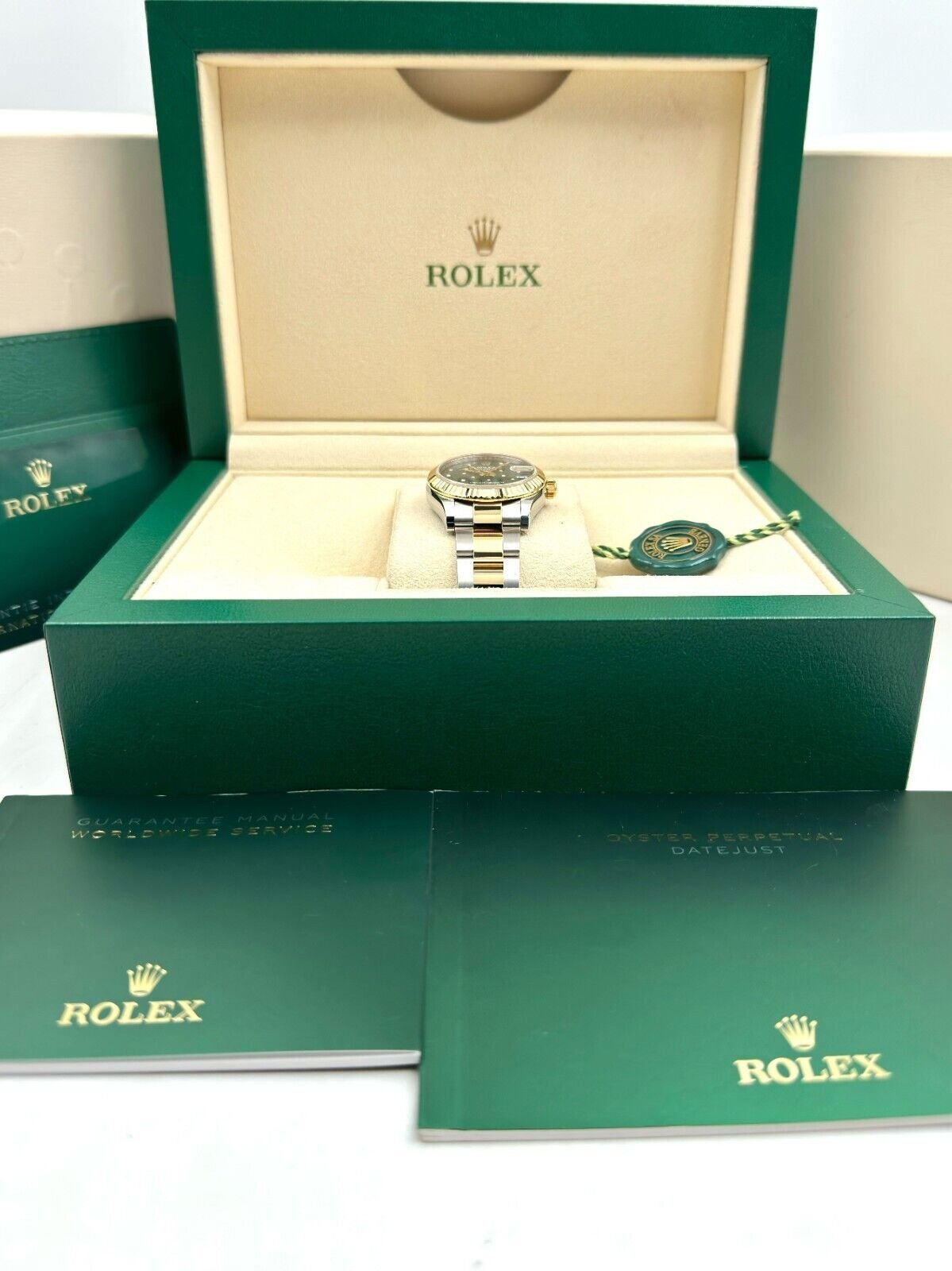Introducing the Rolex Datejust 31 278273 (Year: 2023) – a testament to timeless design and precision. This piece features a green dial, two tone yellow gold/stainless steel bracelet, and 31 mm steel case, making it a statement piece that effortlessly captures attention.