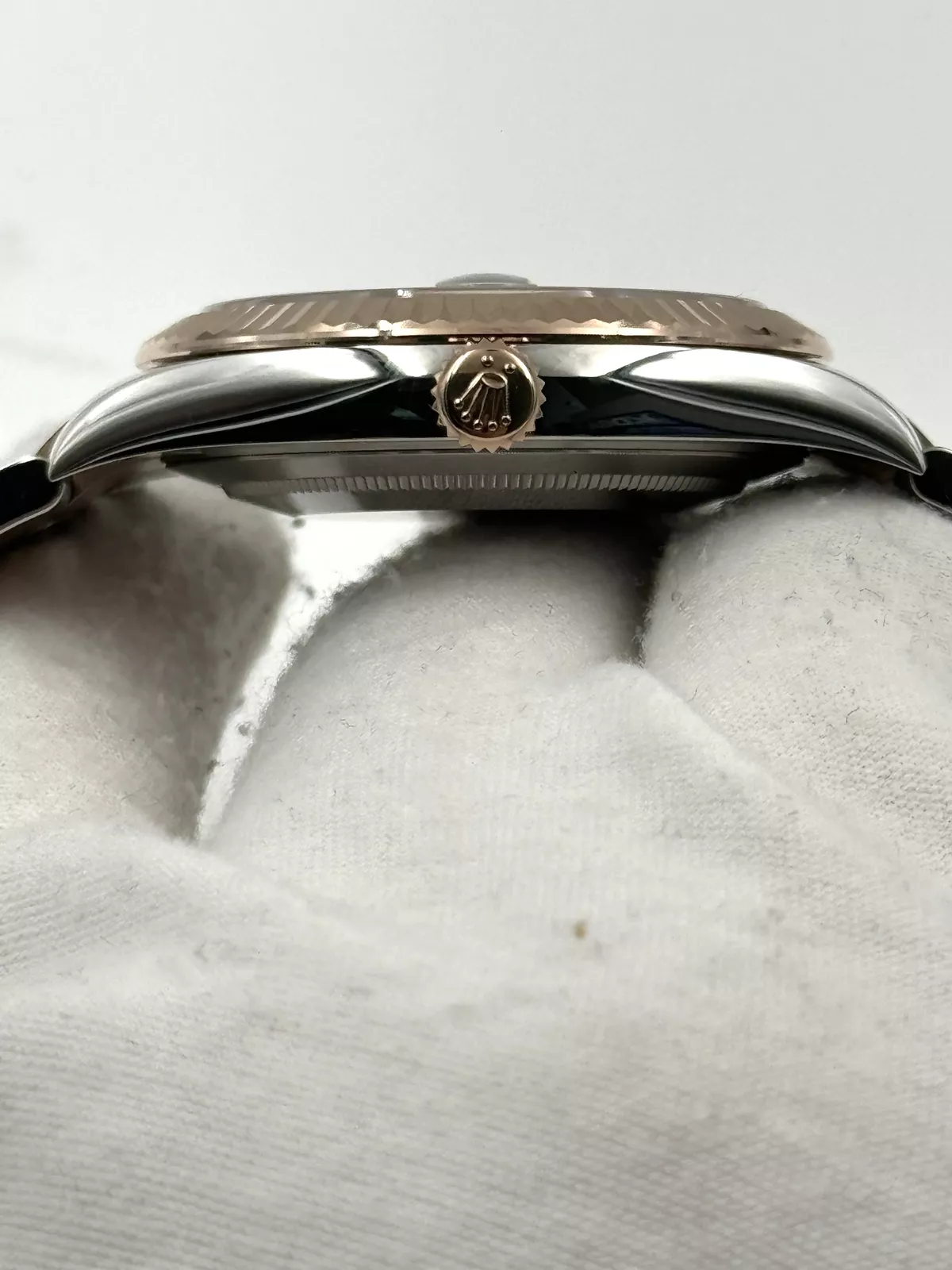 The chocolate dial is rich and warm, with luminescent Everose gold hour markers and hands that ensure legibility in all lighting conditions. The simple yet elegant index layout maintains a clean look, while the date window at 3 o’clock, magnified by Rolex’s signature Cyclops lens, adds functionality to this timeless design.