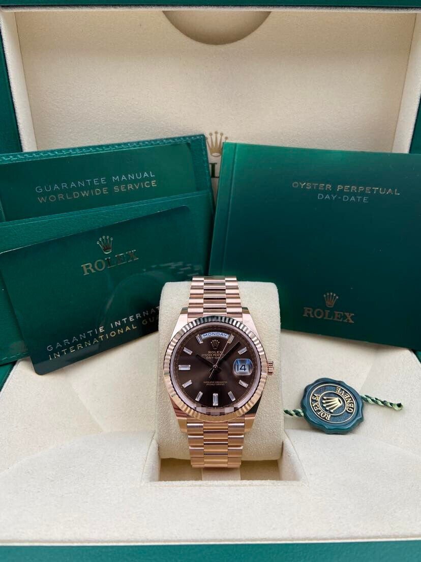 Introducing the Rolex Day-Date 228235 (Year: 2023) – a testament to timeless design and precision. This piece features a brown dial, rose gold bracelet, and 40 mm rose gold case, making it a statement piece that effortlessly captures attention.
