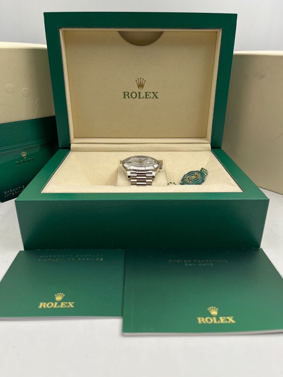 Introducing the Rolex Day-Date 228239 (Year: 2023) – a testament to timeless design and precision. This piece features a silver dial, white gold bracelet, and 40 mm white gold case, making it a statement piece that effortlessly captures attention.