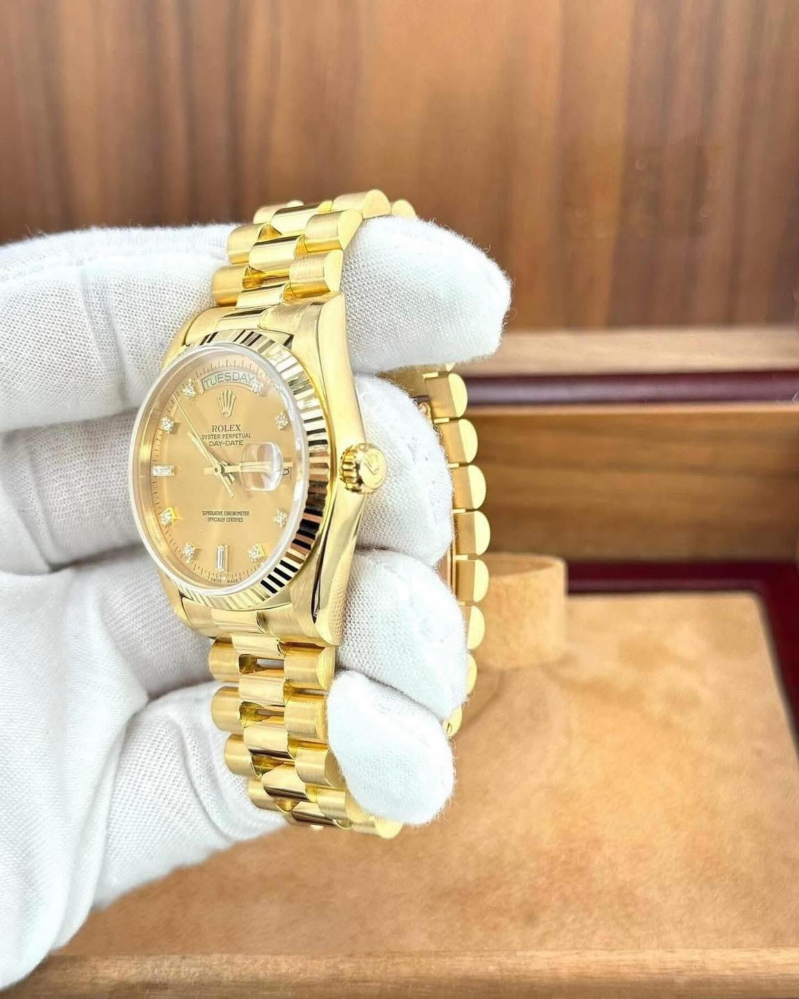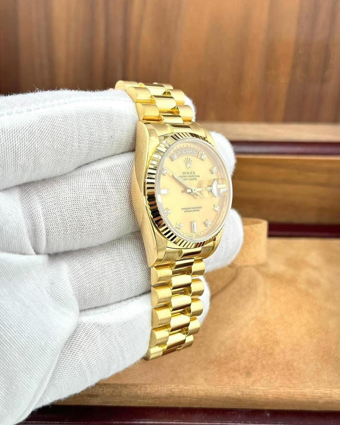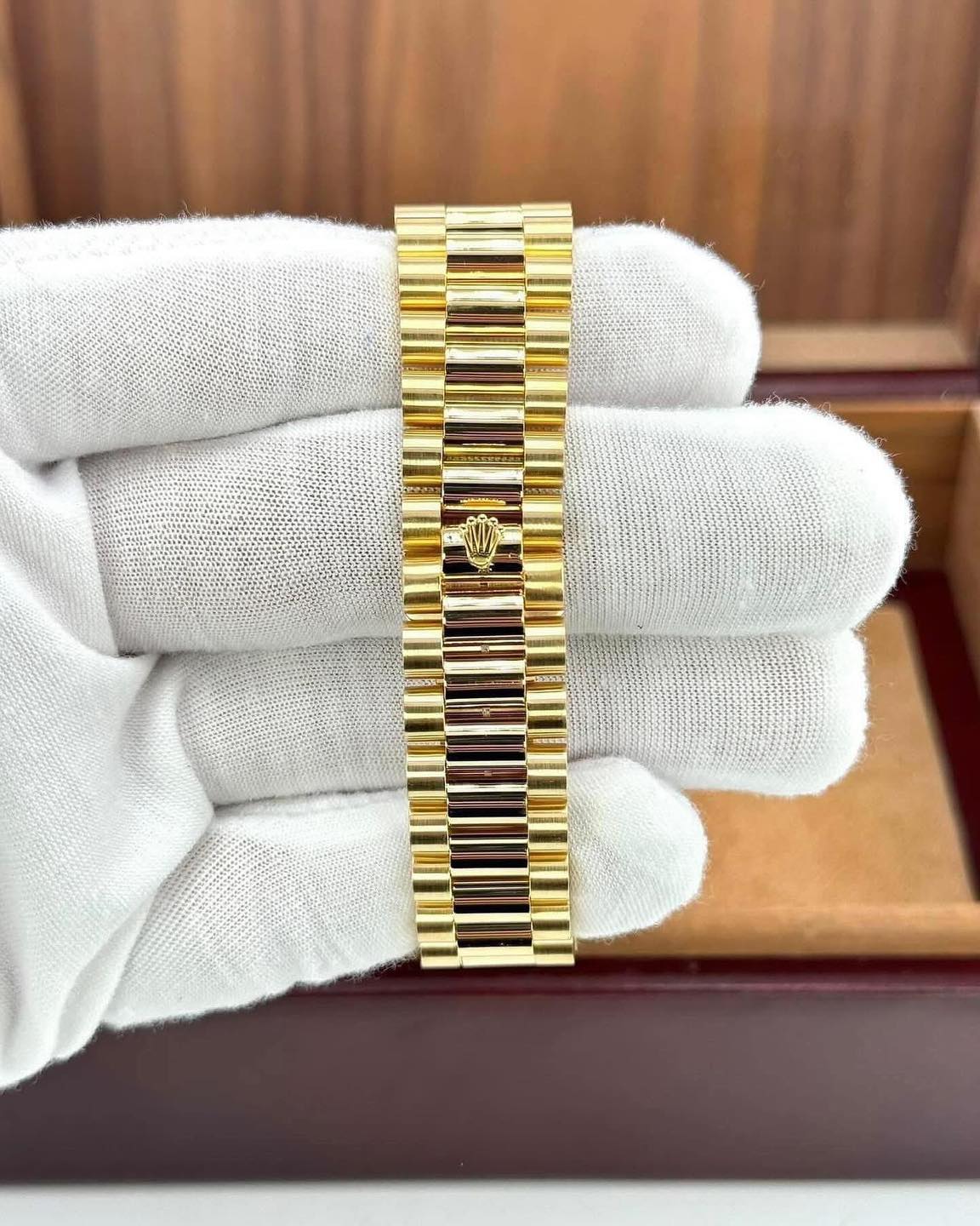 •  Solid 18k Yellow Gold – Case, Crown, Bezel & President Bracelet