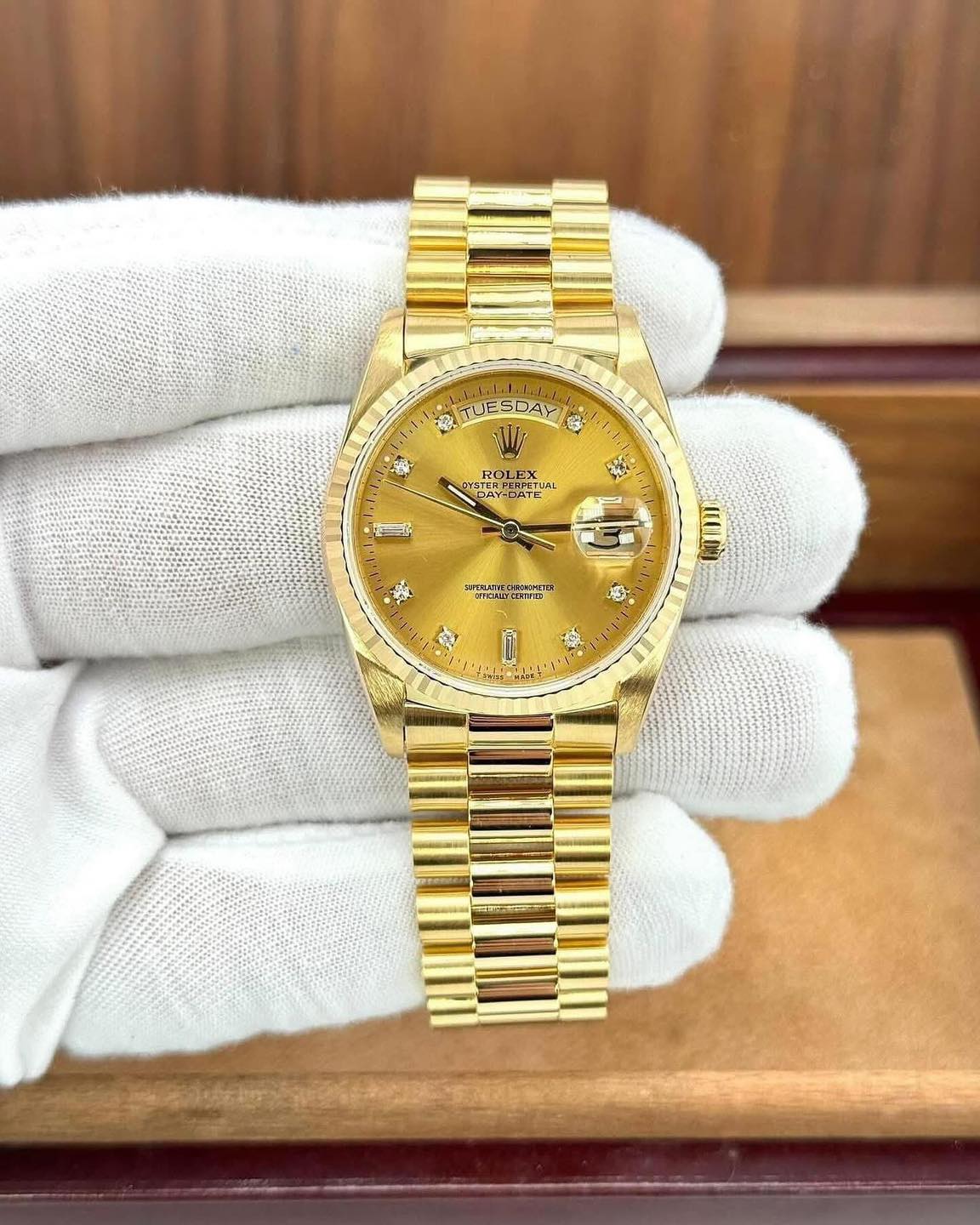 Rolex Day-Date President 36mm | 1980 Model | – Ref. 18038 – Solid 18K Gold – Champagne Diamond Dial Full Set | Excellent Condition
