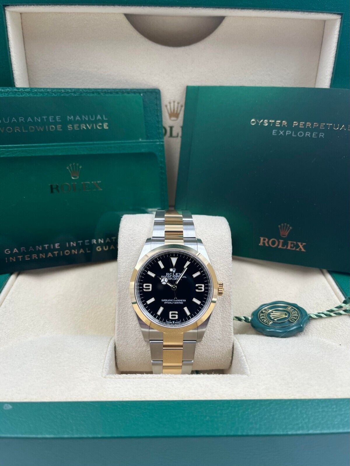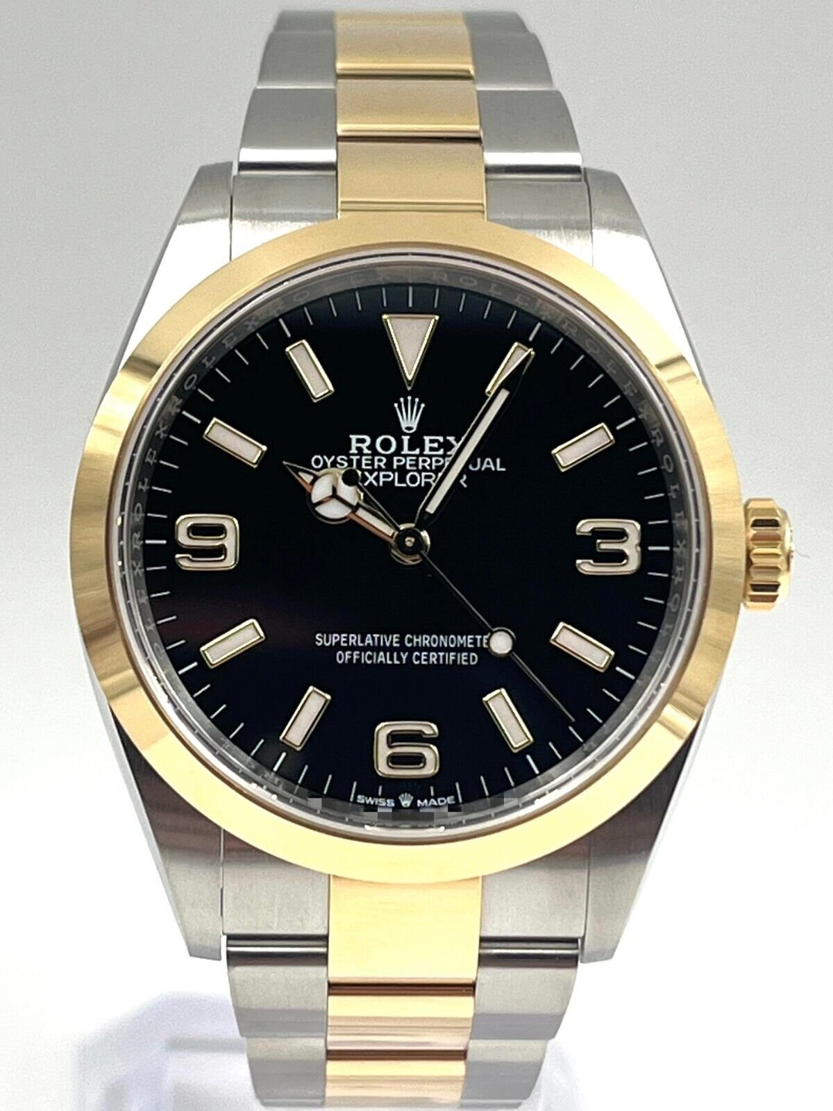 Introducing the Rolex Explorer I 124273 (Year: 2024) – a testament to timeless design and precision. This piece features a black dial, two tone yellow gold/stainless steel bracelet, and 36 mm steel case, making it a statement piece that effortlessly captures attention.