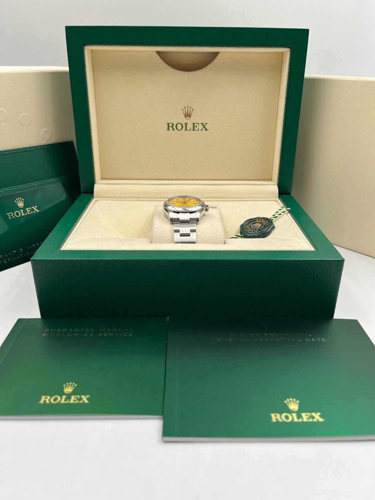 Introducing the Rolex Oyster Perpetual 31 277200 (Year: 2020) – a testament to timeless design and precision. This piece features a yellow dial, steel bracelet, and 31 mm steel case, making it a statement piece that effortlessly captures attention.