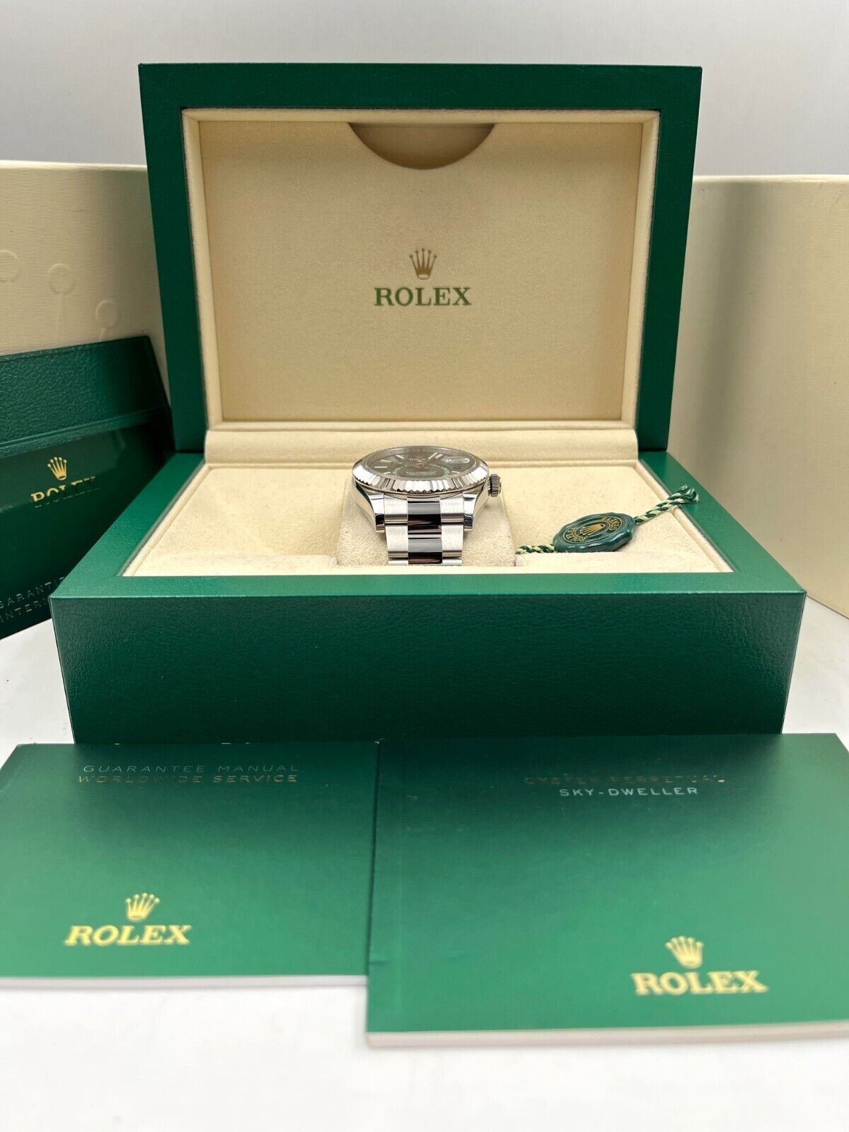 Introducing the Rolex Sky-Dweller 336934 (Year: 2024) – a testament to timeless design and precision. This piece features a green dial, stainless steel bracelet, and 42 mm steel case, making it a statement piece that effortlessly captures attention.